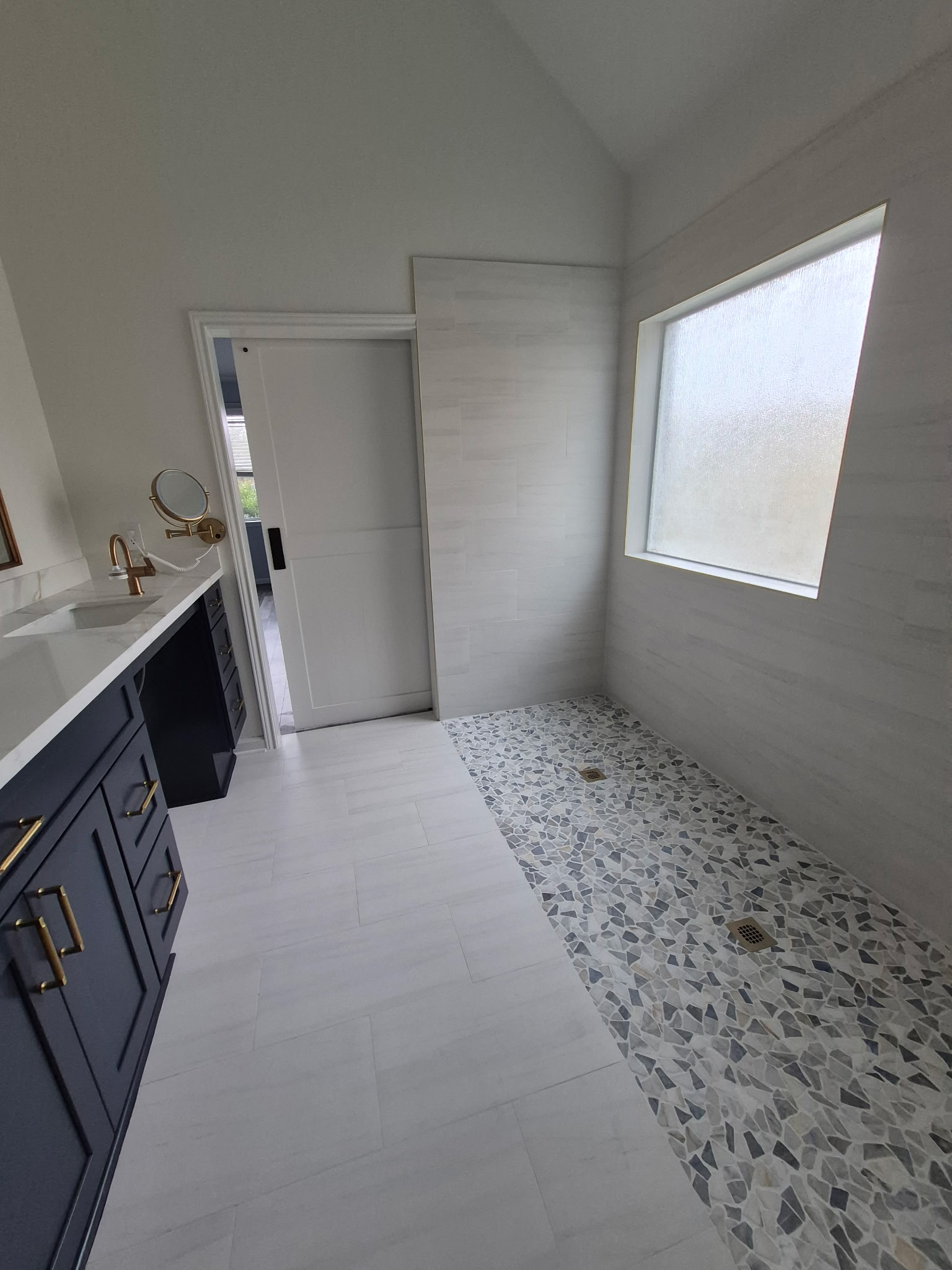 We removed their current shower and pony wall to make one large, zero-entry shower so that the homeowner's wheelchair could easily enter and exit. We added fresh tile to the shower floor, walls, and around the window.